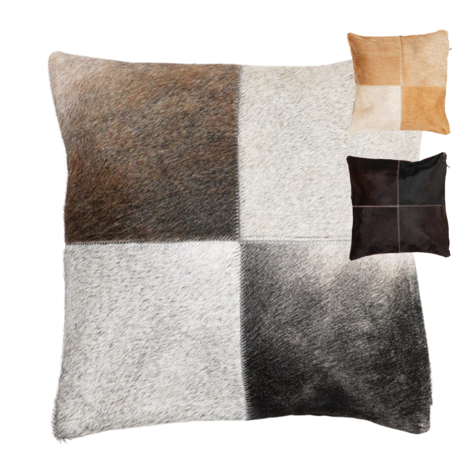 Chaque coussin est fabriqué à la main à partir de quatre carrés soigneusement sélectionnés de véritable peau de vache. Ces pièces sont assemblées manuellement pour créer un patchwork moderne et raffiné, plein de caractère.